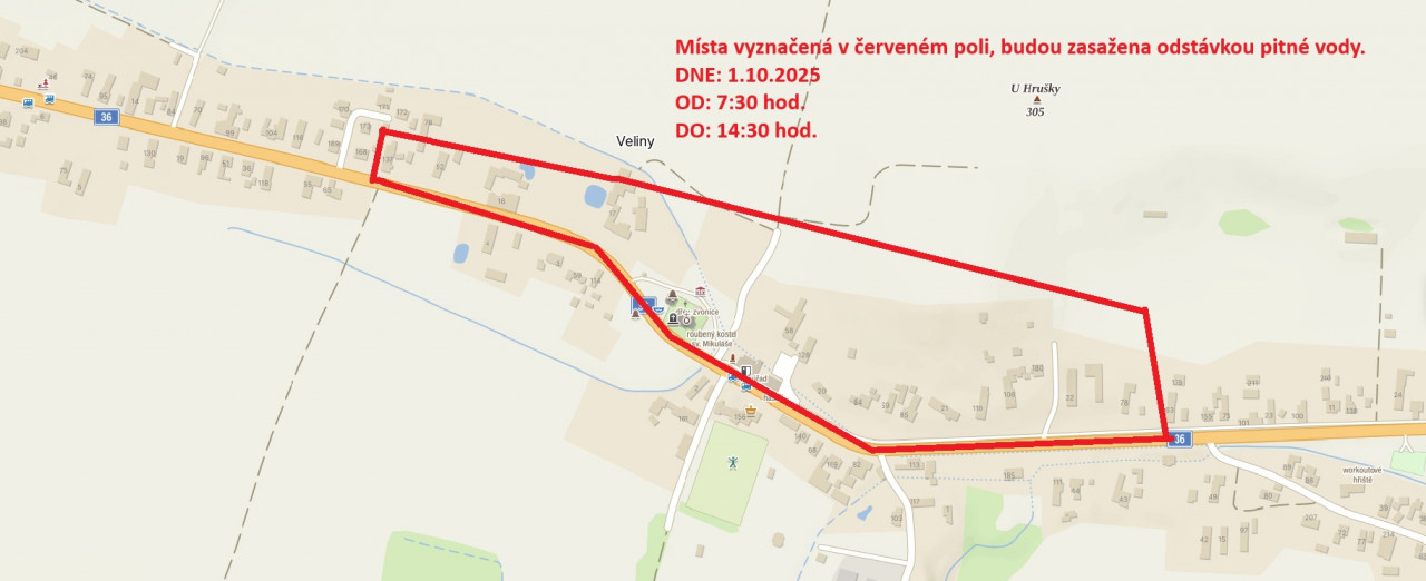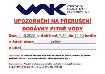 Upozornění na odstávku pitné vody v části obce Veliny -středa 1.10.2025